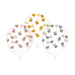 Повітряна кулька (B105, 30 см), асорти серця золото, срібло, рожеве золото на прозорому 100